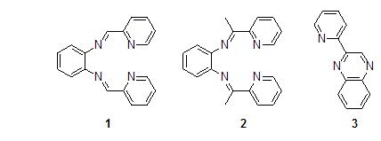 鄰苯二胺與2-吡啶甲醛反應時得到的是n4席夫堿配體1[1],但是當把2-吡啶甲醛換成2-乙?;拎r,以氯甲酸甲酯為催化劑,在異丙醇中反應沒有得到相應的n4席夫堿配體2,而是得到了苯并六元環產物即2-(2′-吡啶基)喹喔啉3[2]。